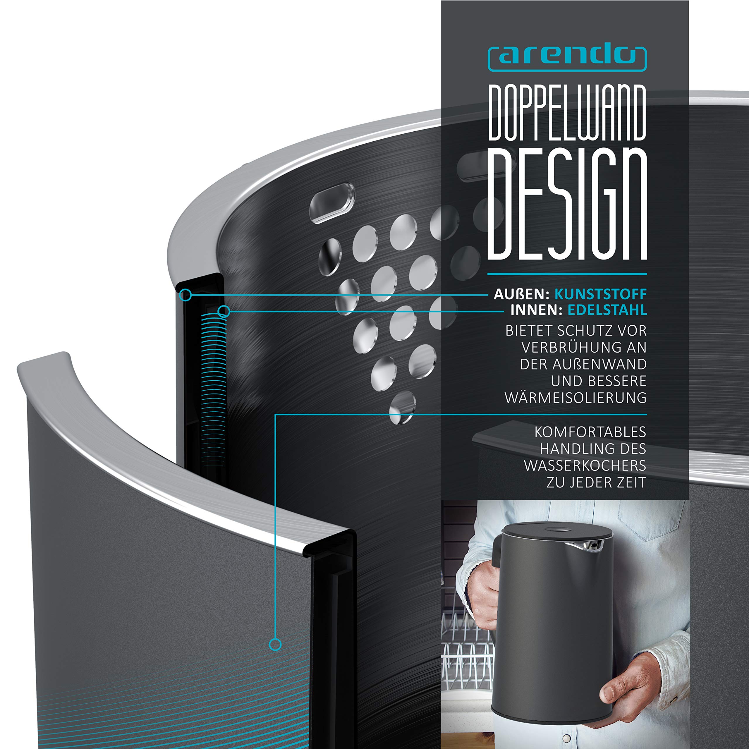 Arendo - Edelstahl Wasserkocher mit Temperatureinstellung 40-100 Grad in 5er Schritten - Doppelwand Design - Modell ELEGANT - 1,5 Liter - 2200 W - Teekocher mit Temperaturanzeige - GS - Cool Grey