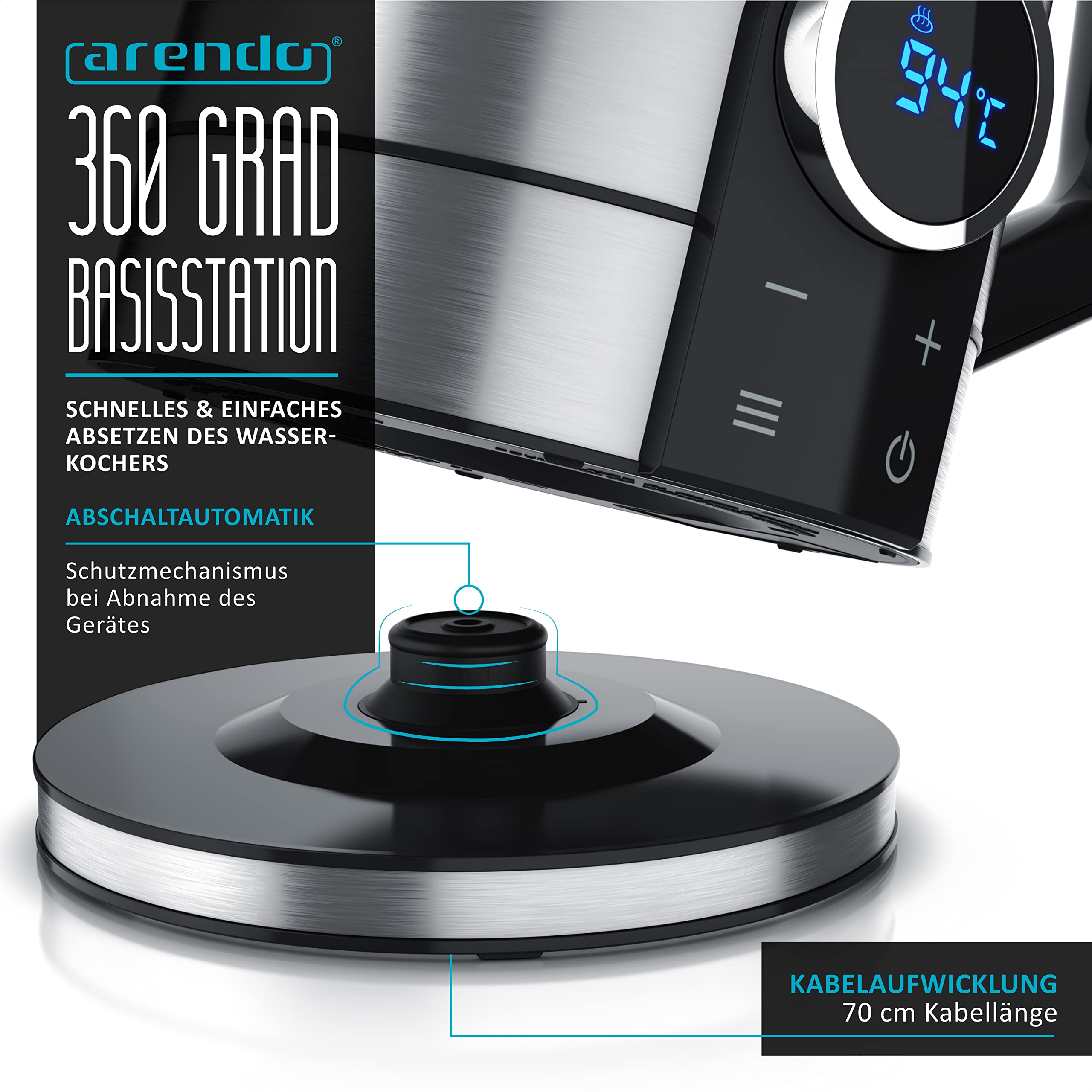 - ABMESSUNGEN: Höhe 24,5 cm x Breite mit Griff 23,5 cm / ohne Griff 16 cm | Kabellänge 70 cm | GEWICHT: Wasserkocher 861 g, Basis 197 g | LIEFERUMFANG: Arendo Wasserkocher DIVINE mit 360° Basis plus Bedienungsanleitung.
